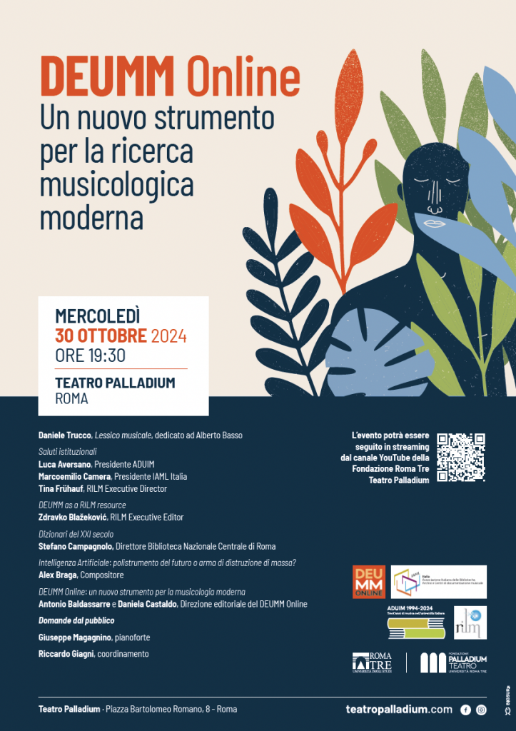 The program (below) will include Daniele Trucco’s DEUMM-inspired music, greetings from Luca Aversano (President, ADUIM), Marcoemilio Camera (President, IAML Italia), and Tina Frühauf (Executive Director, RILM), as well as presentations by Zdravko Blažeković (Executive Editor, RILM), Stefano Campagnolo (Director, Biblioteca Nazionale Centrale di Roma), Alex Braga (composer), and DEUMM Online’s general editors Antonio Baldassarre and Daniela Castaldo. Pianist Giuseppe Magagnino will also perform works by Ellington, Beethoven, The Beatles, and more.