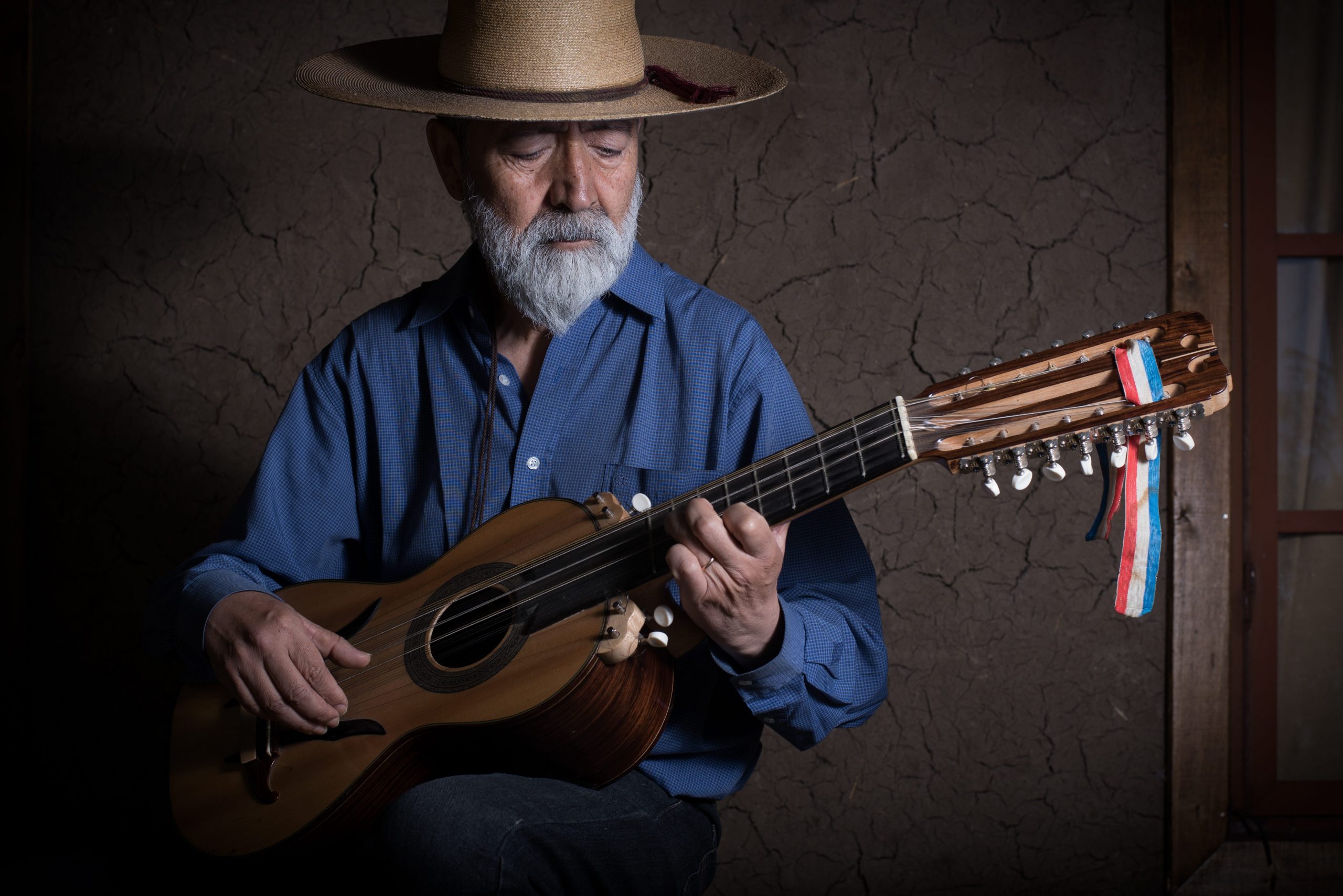 The guitarrón, an instrument of central Chile, is known as one of the most complex stringed instruments in the Americas due to its unique string arrangement and quantity. Shaped like a guitar, the guitarrón features a total of 25 strings–21 arranged in five courses, with an additional four strings positioned along the sides. The guitarrón is customarily used to accompany sung poetry in décimas, a Spanish stanza form consisting of ten lines.