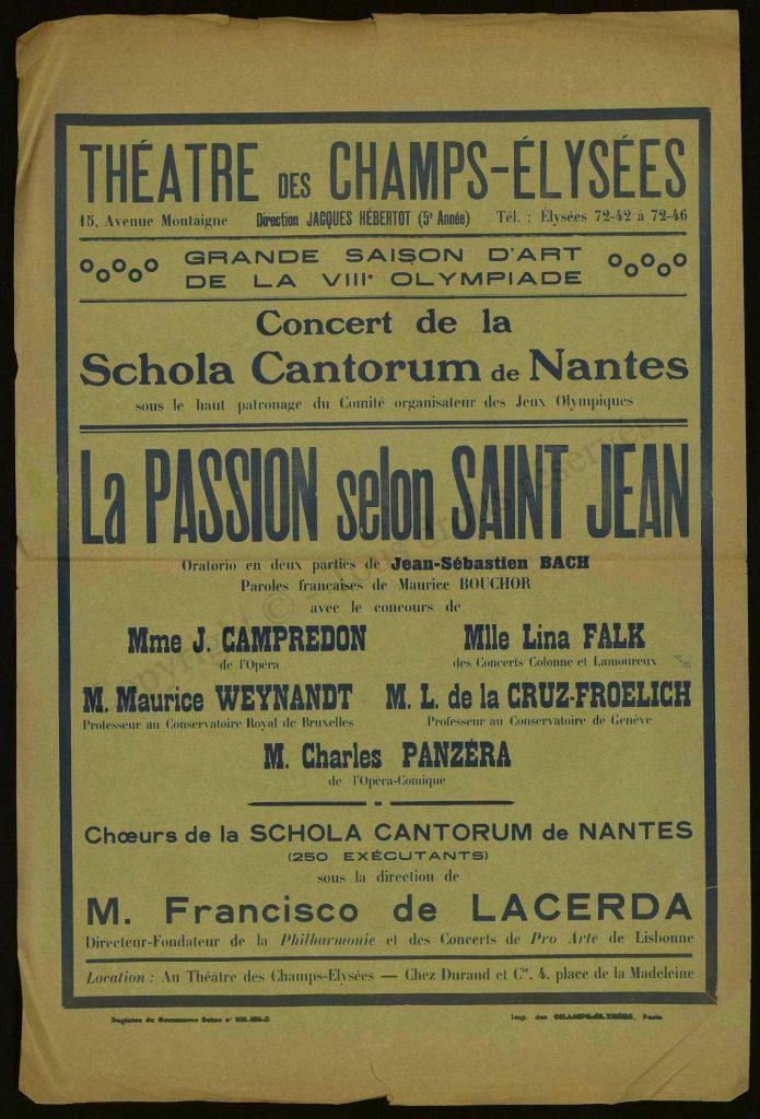 In 1913, the Schola Cantorum de Nantes was founded under the direction of Marguerite Le Meignen (1878–1947), the first official statutes of the music association are dated 1920. It corresponded to the expectations of the new concert associations, such as the Concerts populaires (1910), as well as those of various choirs, including A Capella (1908) or Les Chanteurs de Notre-Dame (1902), that emerged across the city in the early part of the century. The Schola brought about musical innovation by establishing a large mixed choir, which included a symphony orchestra. By the first decade, the efforts of the concert associations appeared to wane. Although opera still flourished in the city theaters (despite a fire in the Théâtre de la Renaissance in 1912), choral singing flourished in the Maitrise de Notre-Dame or in amateur ensembles. The press and critics regularly pointed out that Nantes did not have concert companies like Angers.