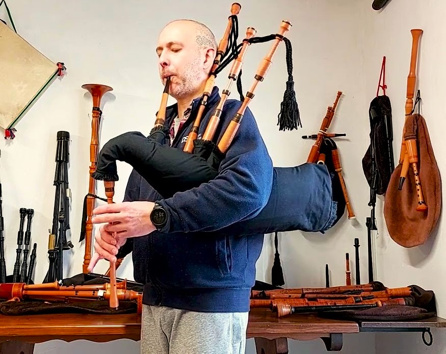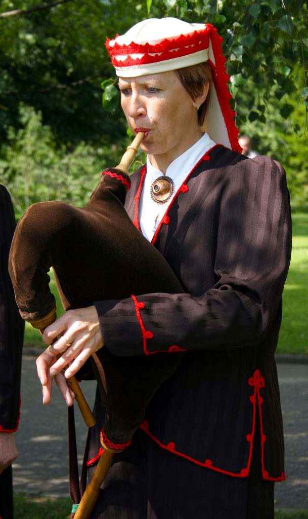 A bagpipe is an aerophone instrument with one or more sounding pipes, each with a single or double reed. The pipes are made to sound by air from a wind container in the form of a bag, which is pressurized by the arm of the player (usually the left one). The wind container is fed either directly from the player’s lungs via a blowpipe or indirectly via bellows. In many languages the bagpipe is simply referred to as a pipe, such as the northern Italian piva (pictured above), Celtic bagpipes such as pìob mhór (large pipe), or the Estonian torupill (reed pipe).