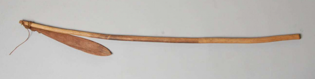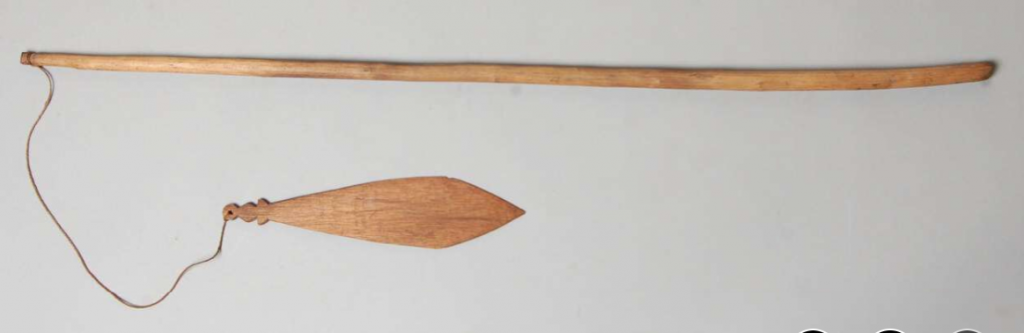 The kidiu (pictured above) is a unique aerophone in Malaysian folk music, specifically a bullroarer, which is a type of free aerophone that lacks an air column or closed air reservoir. Used by the Kenyah-Badang ethnic group in the Upper Rejang River region of Sarawak, the kidiu is typically played in small ensembles of two or three bullroarers to create melodies. The kidiu consists of a flat, oval disc made from wood or bamboo, with precise dimensions–at least ten centimeters in length, about eight to ten centimeters in width, and two to three centimeters in thickness. The disc is attached to a string, which is connected to a bamboo pole with a handle, with both the string and bamboo pole being approximately the same length.
