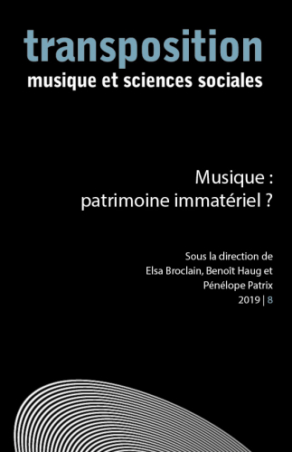 Broclain, Elsa, Benoît Haug, and Pénélope Patrix, eds. Transposition: Musique et sciences sociales VIII(2019): Musique: Patrimoine immatériel? [RILM Abstracts of Music Literature, 2019-24678]