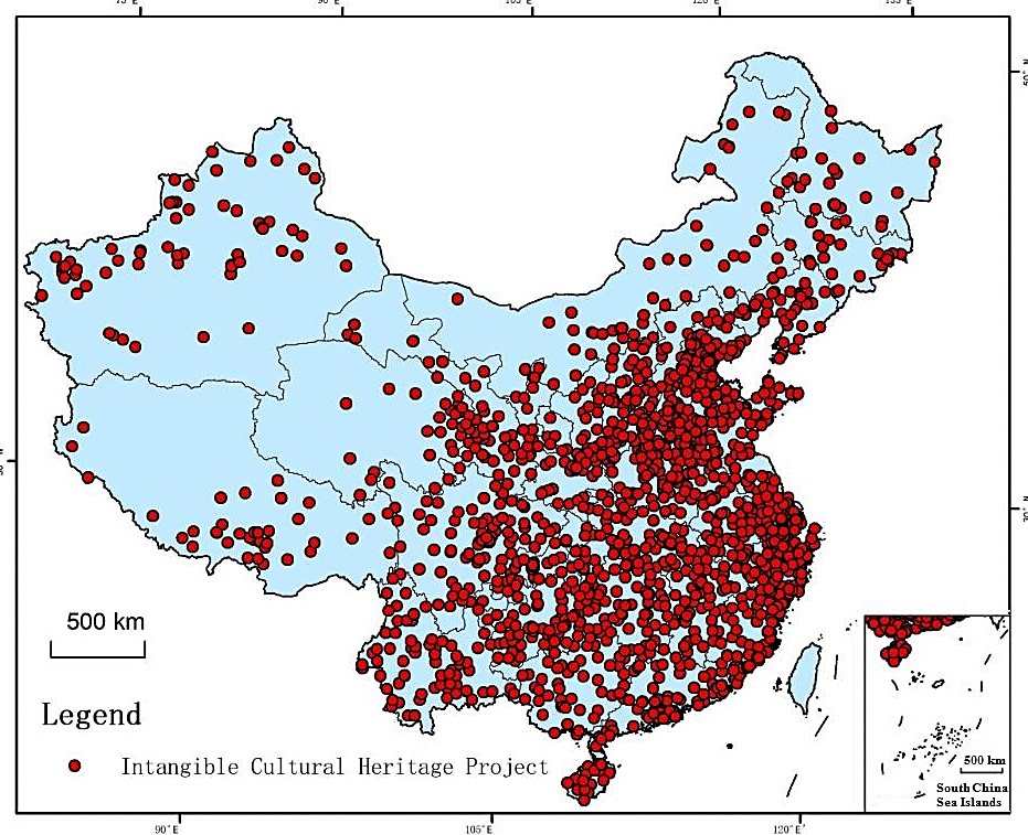 Geographic distribution of ICH sites in China (2021). Source: Institute of Geographical Sciences and Natural Resources Research, Chinese Academy of Sciences (https://www.geodoi.ac.cn/WebEn/doi.aspx?Id=1925)